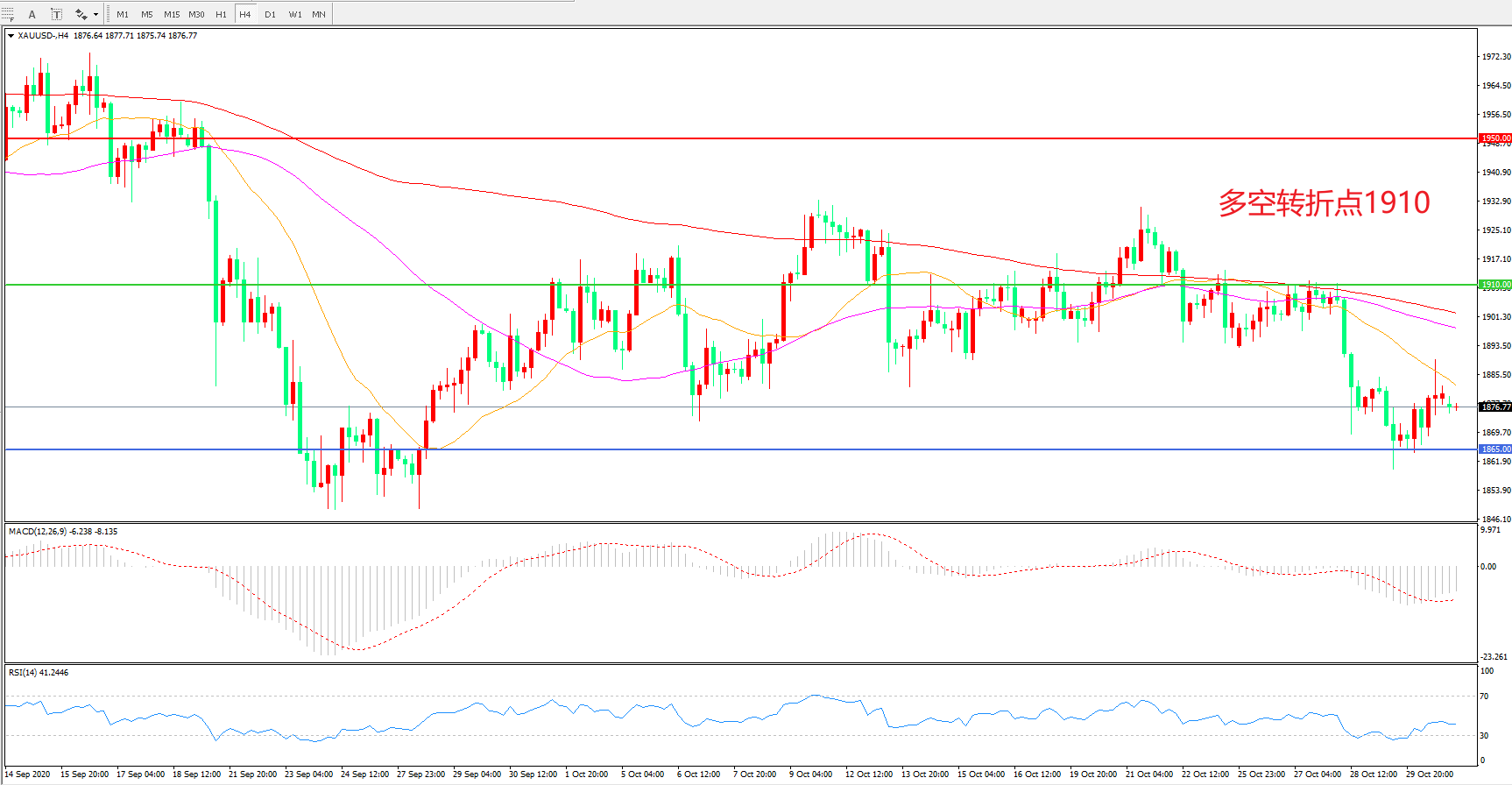 过去一段时间,金价延续弱势震荡形态,在跌破1900美元大关之后承受较大的下行压力,随着美国财政刺激计划流产,欧洲主要国家因新冠病例激增重新实施封锁措施,美指获得一定的上行动力,金价冲高回落后,收报1880.31美元/盎司。