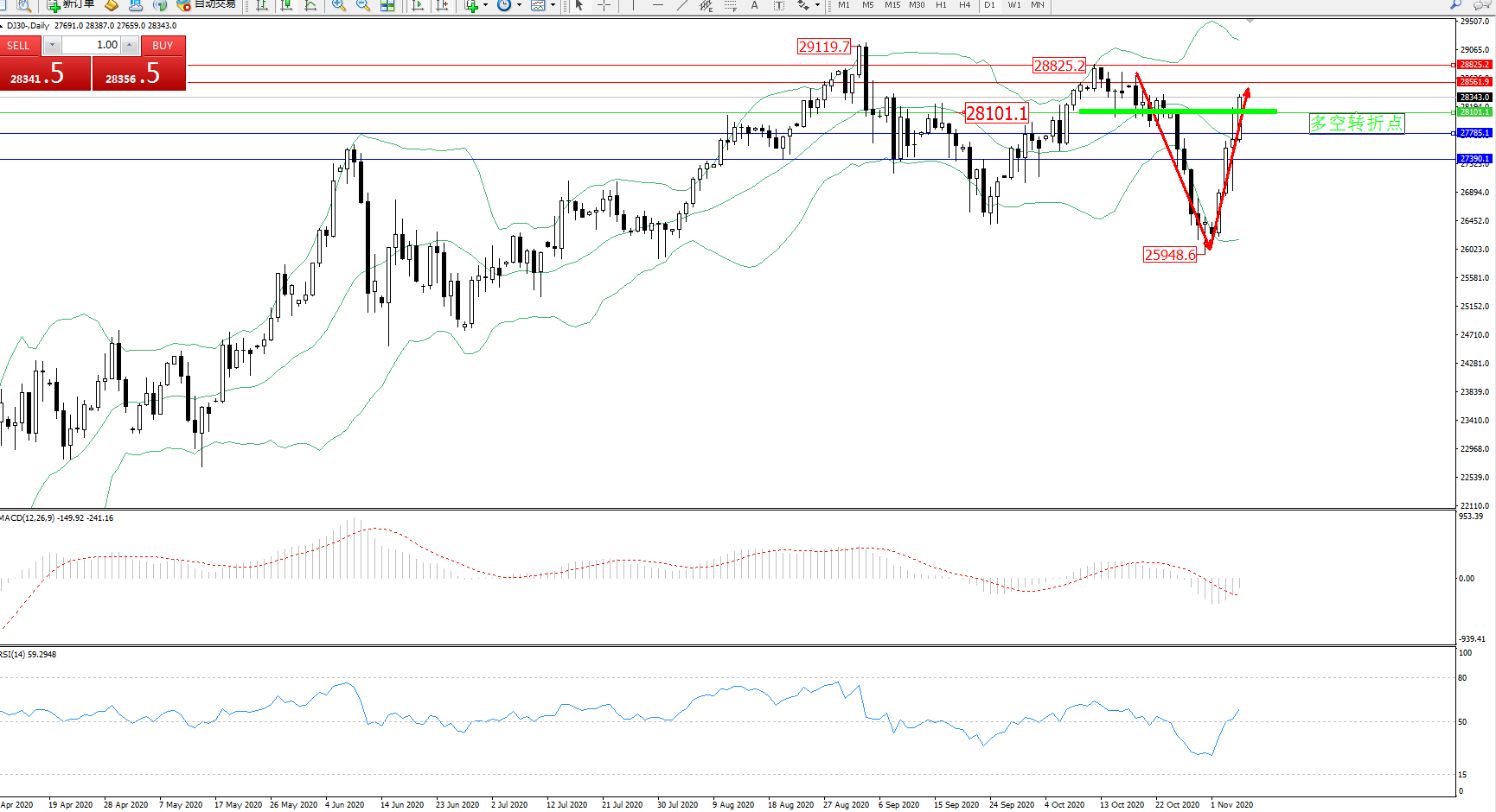 技术点评:空头动力延续布林带指标下轨持续下行后,低位触及25948附近得到支撑强势反转呈V型态势拉升上扬,突破布林带指标中轨附近节点进入中上轨区间震荡,有进一步上扬态势,布林带指标呈收口走势持续中,关注中上轨区间转折点,MACD指标处于空头区域低位弱势整理上移中,即将触及0轴线附近节点,RSI指标处于空头区域震荡后强势拉升上扬,突破50均衡线后有继续上行态势;