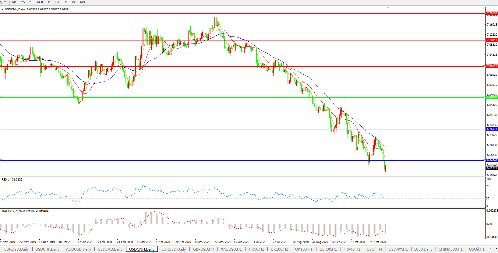 美元兑人民币USDCNH 日线图:
