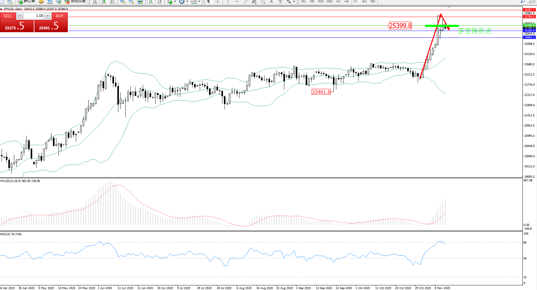 日经225指数11月12日(周四)收盘上涨165.40点,涨幅0.65%,报25515.00点。日本9月核心机械订单三个月来首降,令资本支出复苏前景蒙阴。研究员熊野英生表示,生产和出口正快速复苏,因此企业获利也可能相当迅速地改善。但鉴于第二季产出跌幅那么大,企业对于资本支出仍抱持审慎态度。虽然日内美元指数略有反弹,尤其是在贸易风险复燃的背景下相对商品系货币走强,因美国选情仍不明朗,司法争执料将旷日持久,同时全球市场在消化了疫苗研发的初步利多后,转而重新对其应用前景重新审视,这平抑了之前过度乐观的情绪,各国股市普跌。