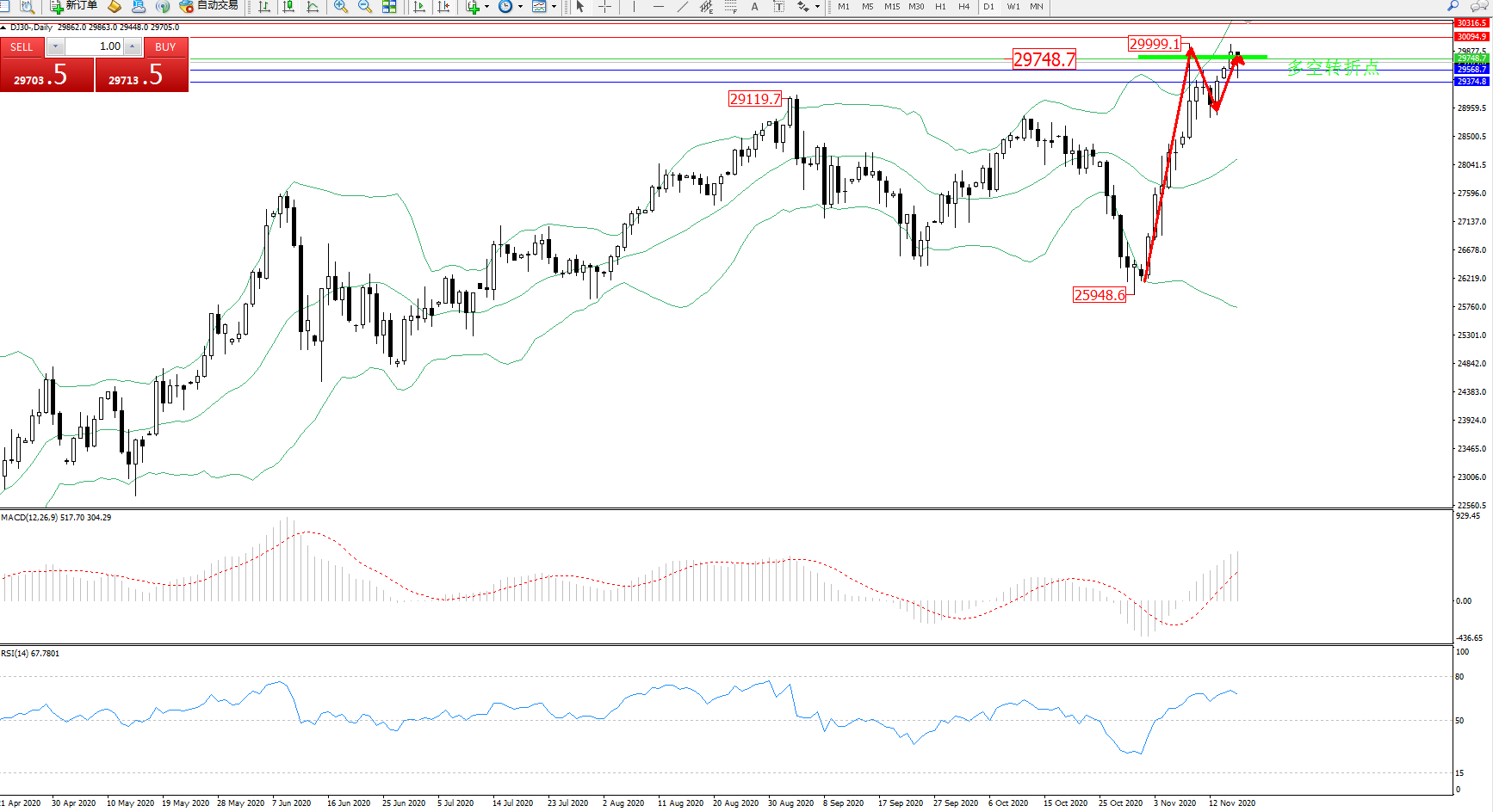 道琼斯指数指数11月17日(周二) 收盘下跌167.09点,跌幅0.56%,报29783.35点;美国10月零售销售月率实际公布0.30%,预期0.5%,前值1.9%;美国10月零售销售年率实际公布6%,前值5.36%。机构评美国10月零售销售数据指出,美国10月零售销售不及预期,且可能进一步放缓,因新冠肺炎病例激增,以及数百万失业的美国人因失去政府的财政支持导致家庭收入下降。限制措施和消费者避免前往酒吧和餐馆等拥挤场所可能会降低支出,引发另一波失业潮并进一步挤压收入。美国疫情恶化,已超越今年春季,上周10日开始零售业者又开始清点入场人数,部分店家重新启动卫生纸、湿纸巾、洗手乳等商品购买限制。美国疫情越发严重,零售行业也收到严重冲击。不过,疫苗推出的乐观前景或有助于带动消费。到今年年底,将有大约2000万剂新冠疫苗准备运往美国。公司已经准备好了数百万剂的新冠疫苗,等待美国食品药品监督管理局(FDA)批准。计划向其他全球监管机构提交新冠疫苗以获得授权。有望于2021年在全球生产5亿至10亿剂的新冠疫苗。