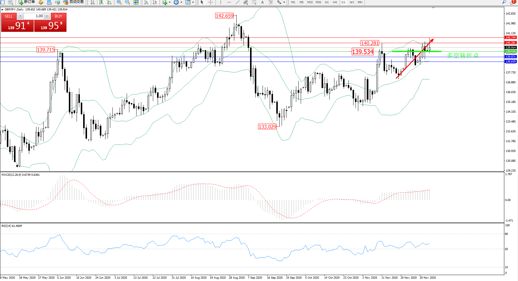 技术点评:多头动力延续布林带指标中上轨区间持续宽幅震荡向上移动态势良好,高位突破布林带指标上轨后出现短暂回撤走势,期间多头动力试探上轨附近节点,前期高位140.281位置破位后已再度多次触及,且有继续上扬迹象,布林带指标呈收口走势后开始有张口迹象,MACD指标处于多头区域持续整理平移中,RSI指标处于50均衡线上方维持整理走势向上移动中;