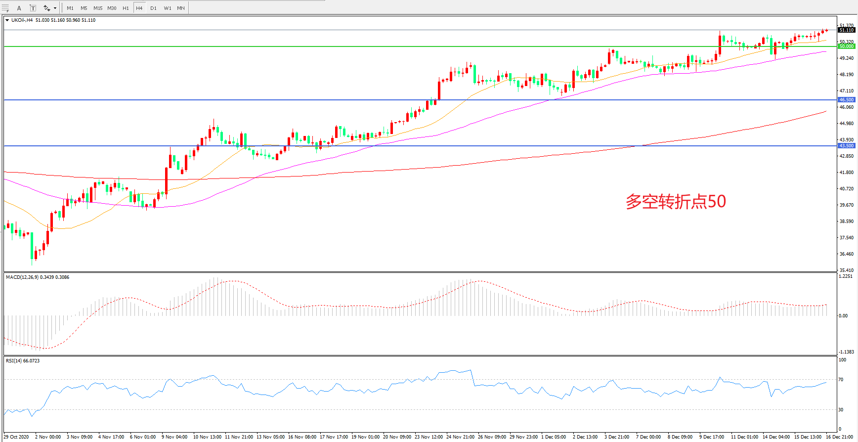4小时图看,油价长阳后延续高位震荡,短期表现较为强势,均线系统成为短期支撑,50美元成为多空分水岭,MACD红柱增加,RSI指标走平,日内震荡上行概率较大。