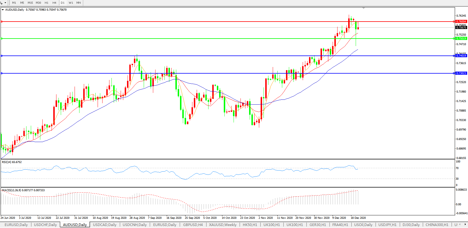 交易策略:0.7500上方看涨,目标0.7600、0.7700