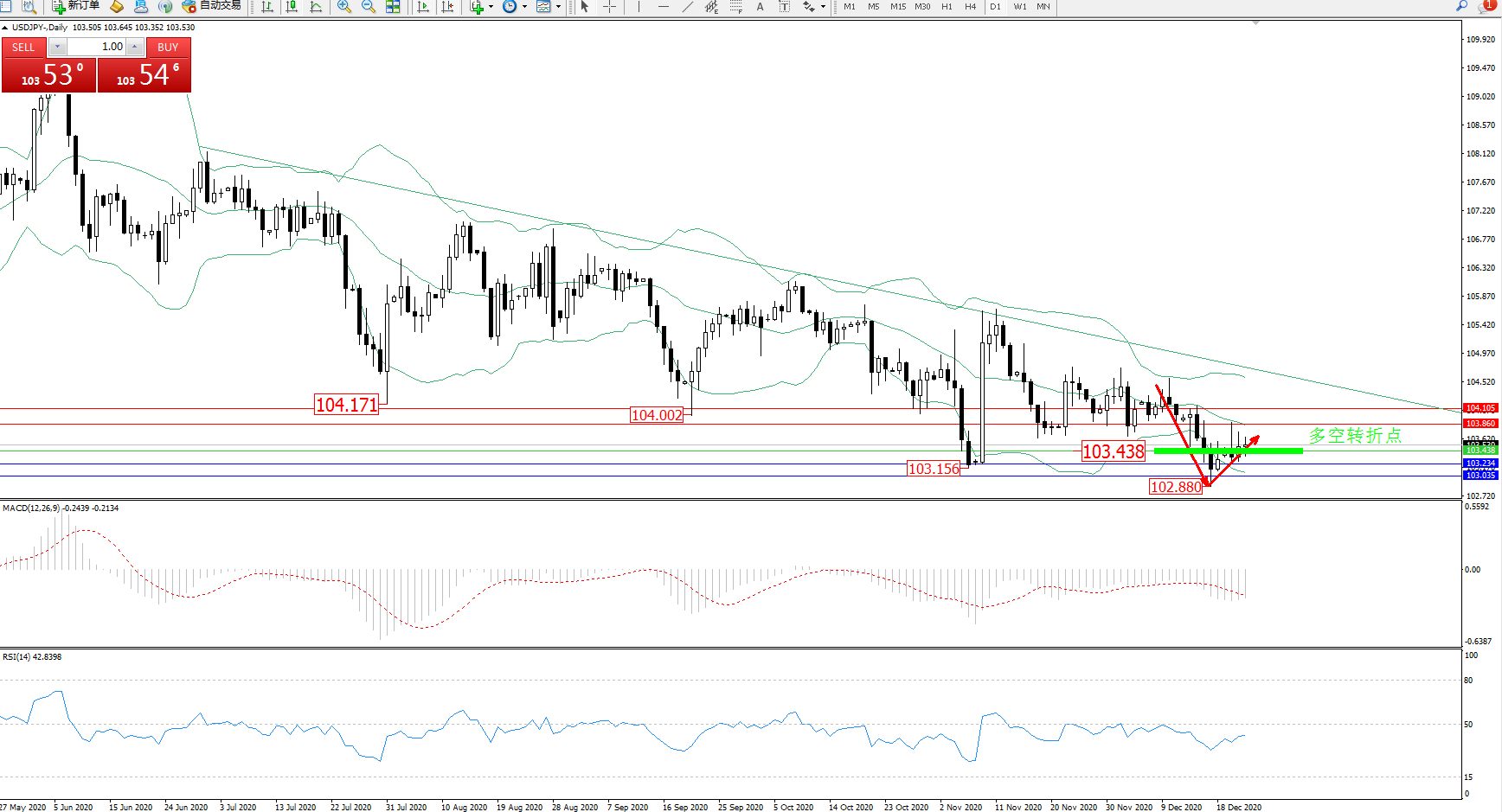 交易策略:103.438上方看涨,目标103.860、104.105