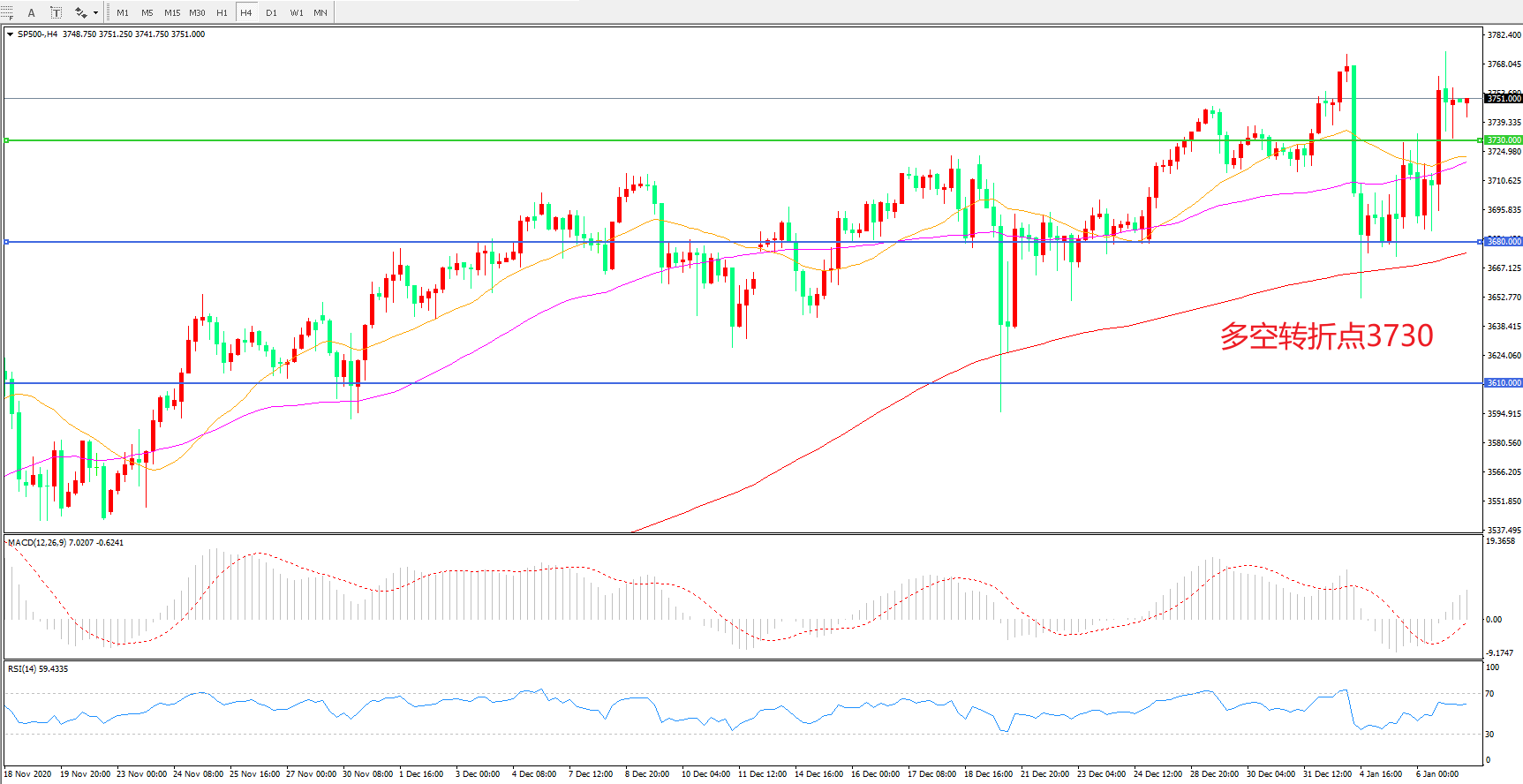周三(1月6日),美国民主党人拿下参众两院,市场预期经济增长可能更强劲,美股盘中转涨,小盘股强势走高,随后,特朗普支持者与警方在国会山附近发生冲突,美国国会大厦因骚乱被封锁,大选认证被迫中止,标普500大幅跳水,回吐部分涨幅,收报3744.25点。目前多个盟国领导人表态,民主选举的结果必须得到尊重。