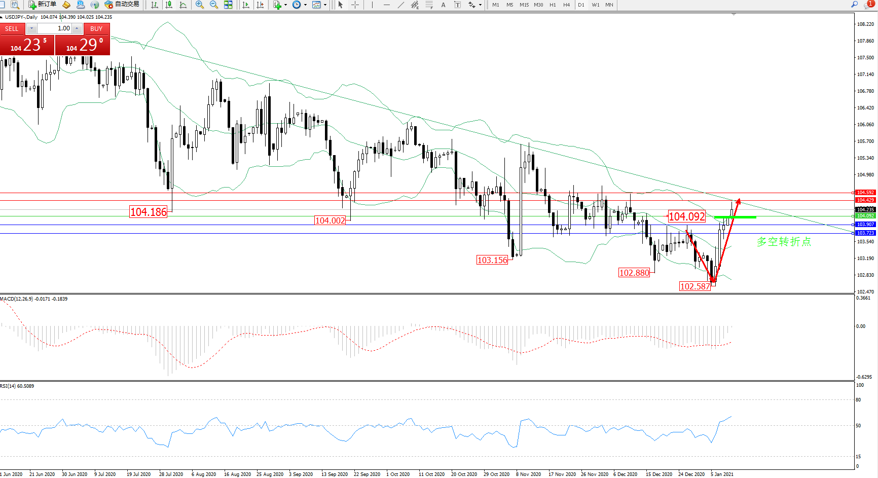美元兑日元涨0.31%至104.26;一度攀升至一个月以来的最高点104.40;一位交易员表示,日元可能会向104.00水平靠拢,周二有12亿美元执行价在104.00日元的期权到期。因美元指数继续走强,且日本疫情继续恶化令东京奥运会延期一年后仍能否举办的前景再度存疑,极大程度地动摇了投资者继续持有日元现金以规避风险的投资者信心,这也令美元兑日元非常有望连续第四个交易日录得反弹收高。而眼下,美元兑日元则正面临去年3月以来持续下行区间上轨的压制,进一步上行依旧面临阻力,日内收复若站稳在104.16处的60日均线上方,则后市仍有望继续蓄力上行破位,上方关键阻力在104.71处的100日均线水平,突破后将意味着中期筑底行情有望进一步展开。市场也正在密切观望本周稍后美联储主席鲍威尔讲话中对宽松政策力度前景的评述,来指引美元指数的进一步走势方向,从而连带影响美元兑日元的走势前景。
