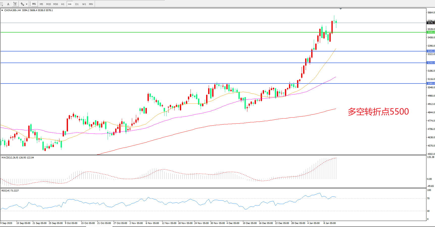 4小时图看,沪深300长阳拉升,短期表现极为强势,高位虽有小幅回调,但上升趋势完好,均线系统呈多头排列,MACD红柱增加,RSI指标走平,日内延续上行概率较大。