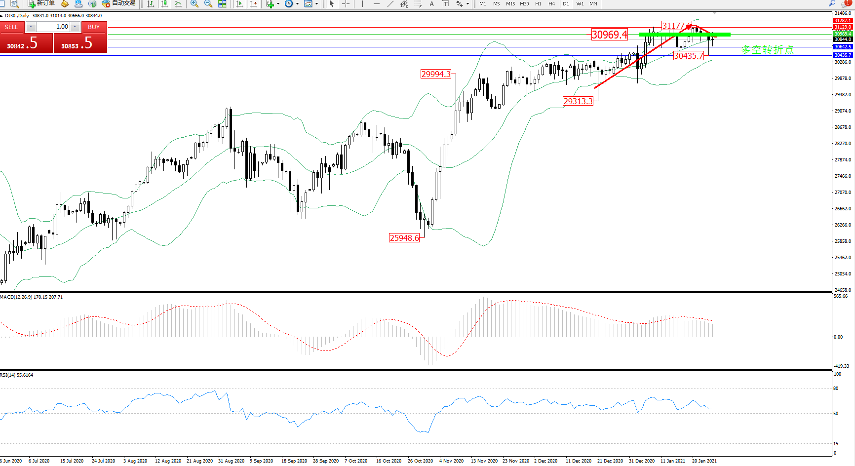 道琼斯指数DJ30—— 日K线图显示: