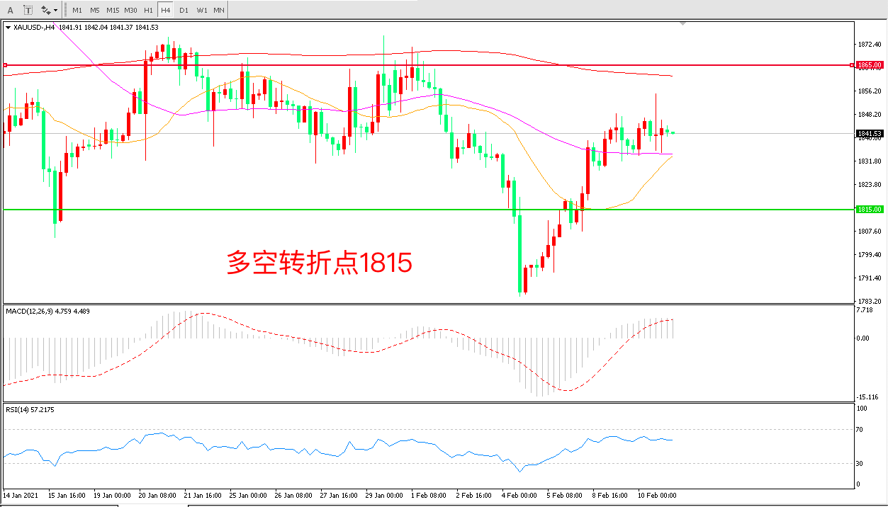 周三(2月10日),美国公布了1月CPI数据,结果该数据表现不及市场预期,美联储主席鲍威尔在讲话声称,美联储承诺将将继续实施QE等宽松政策直至看到美国经济实质性的进一步进展。市场通胀预期提高,现货金价呈现宽幅震荡走势,收报1841.99美元/盎司。