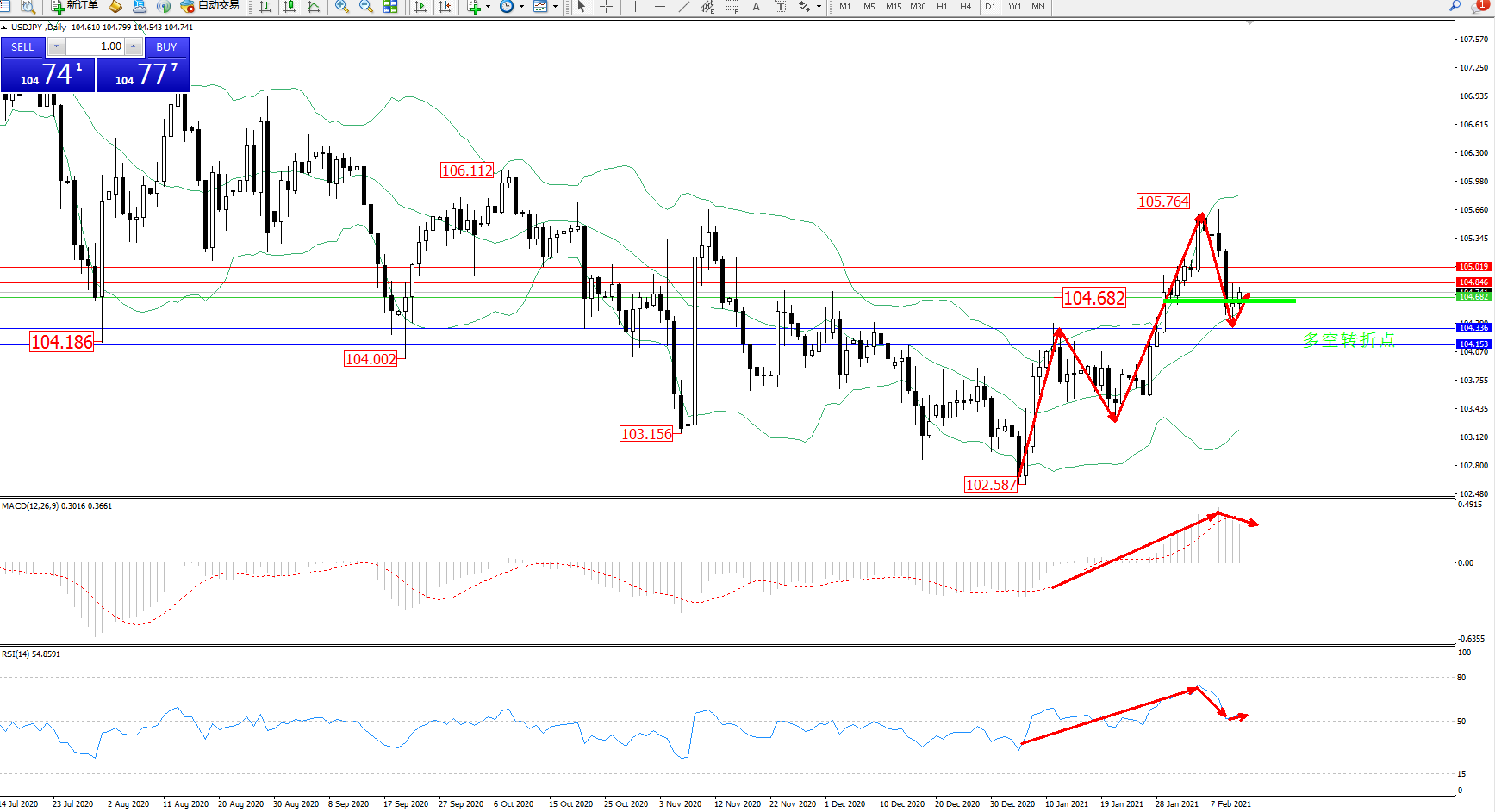 技术点评:多头动力延续布林带指标通道上轨附近持续上行至105.764附近节点,高位遇阻后急速回撤下行,即将触及布林带指标通道中轨附近节点,空头动力有继续向下移动态势,关注中上轨区间关键节点,布林带指标呈张口走势后有收口走势迹象,MACD指标处于0轴线上方多头区域维持整理平移后有下行迹象,RSI指标处于多头区域维持整理后急速下行即将触及50均衡线附近;