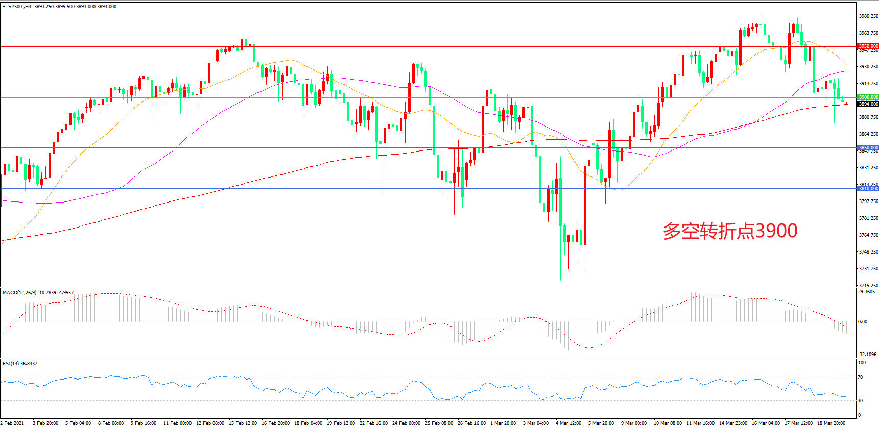 4小时图看,标普500高位震荡后延续低位震荡,整体表现相对低迷,3900成为多空分水岭,3950成为上方阻力,MACD红柱减少,RSI指标走平,日内延续震荡概率较大。