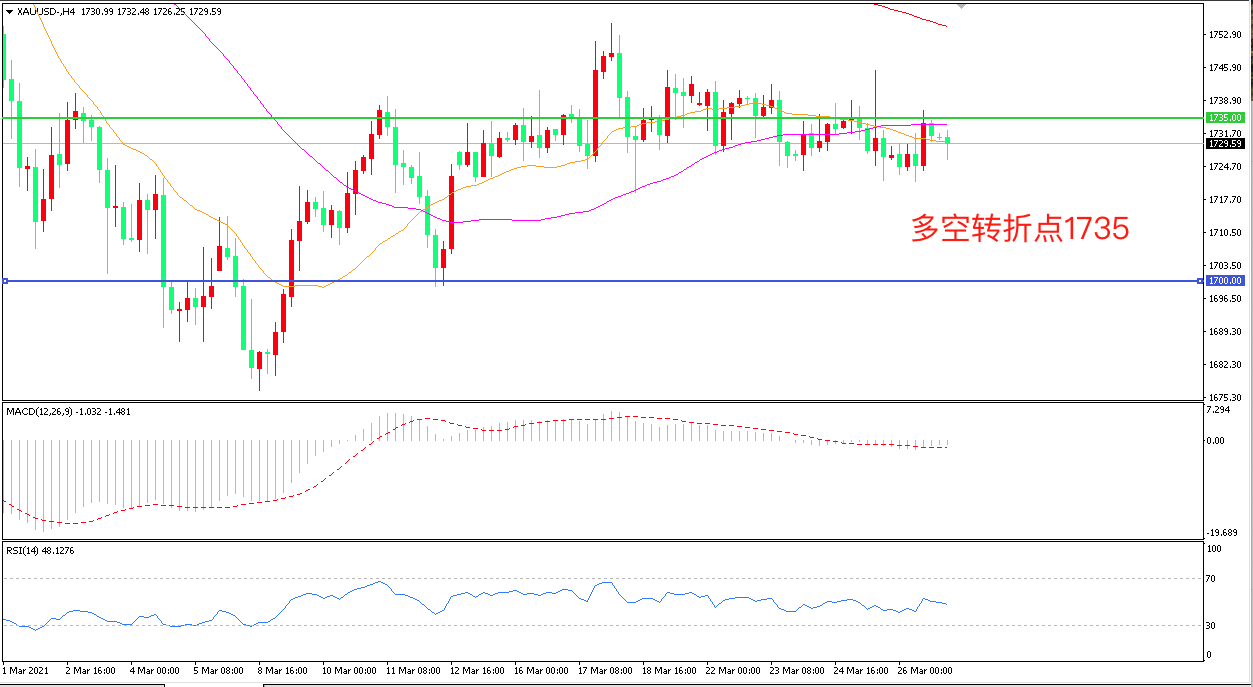4小时图看,金价延续低位震荡整理,整体波幅较小200周期均线逐渐下压,1735成为短期多空分水岭,MACD绿柱增加,RSI指标走平,日内延续震荡概率较大。