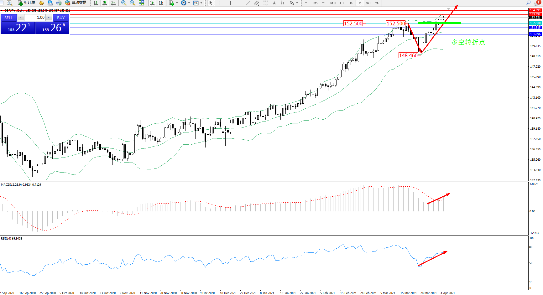 英镑兑日圆持续向上移动至153.132附近震荡,预计英镑兑瑞郎、日元和欧元等低收益G10货币仍将得到良好支撑。疫苗接种和抗疫限制减少加速劳动力市场恢复,全面复苏需要时间;据天空新闻:英国首相约翰逊预计将透露更多5月17日以后国际旅行的规定,英国“疫苗护照”的测试将在9个项目中进行,英国民众对政府应对疫情的作为表示支持的人数超过了批评人数,这是去年5月以来首见。英国的新冠死亡人数是欧洲国家中最高的,但其疫苗接种速度也高于欧洲国家。另一项访问雇主的调查显示,主管们对经济的乐观程度为首相约翰逊2019年胜选以来最高水准,比2月上升了9点,升至正14。