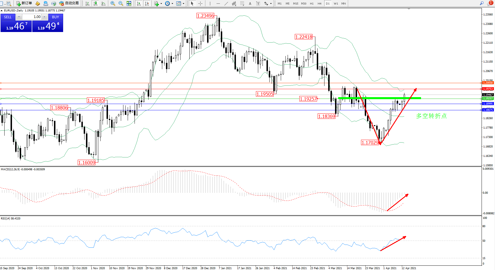 欧元兑美元低位多头强势拉升至1.19467附近震荡,欧盟国家的疫苗接种激增,改善了欧元兑美元的前景,法国前财政部长、欧盟疫苗协调员蒂埃里·布雷顿证实,欧盟疫苗产量“增长非常迅速”,到7月欧盟有望为70%的成年人接种疫苗,在目前阶段,实现这一目标的可能性不大,但达到50%至60%的水平仍是可行的;法国、意大利和德国的感染率让目前的疫情可能有所缓解的情况有所缓解,4月,德国和法国的7天平均疫情有所缓解,意大利的感染情况明显缓解,如果确实看到美元在通胀上升后竞价,带动收益率上升,那么美国较高的收益率和欧洲更好地接种冠状病毒疫苗的证据可能限制欧元兑美元的下行,仍预计欧元兑美元将下跌,但表现应优于其他10国集团货币。