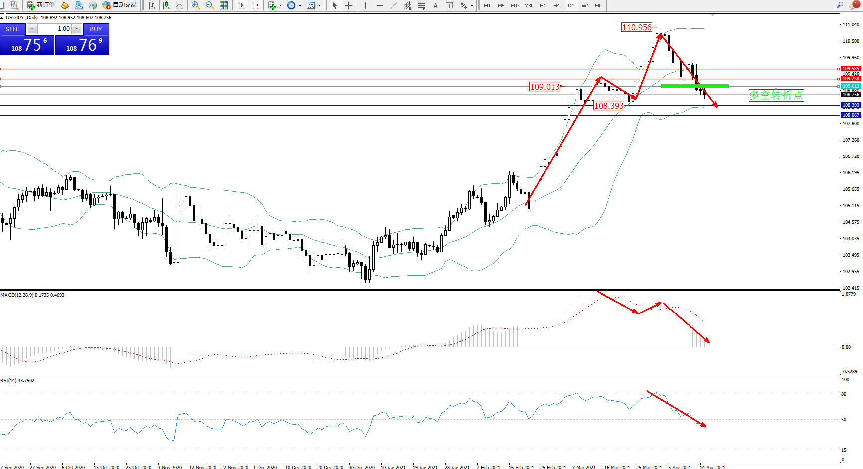 技术点评:多头动力延续布林带指标中上轨区间通道持续震荡上扬,高位抵达110.956位置遇阻回撤,跌破布林带指标中轨附近节点后维持宽幅震荡,空头动力依旧有继续下行迹象,布林带指标呈张口走势后开始缓慢收口,关注中轨附近节点,MACD指标处于多头区域高位震荡回撤,RSI指标高位持续回撤下行跌破0轴线进入空头区域继续下移;