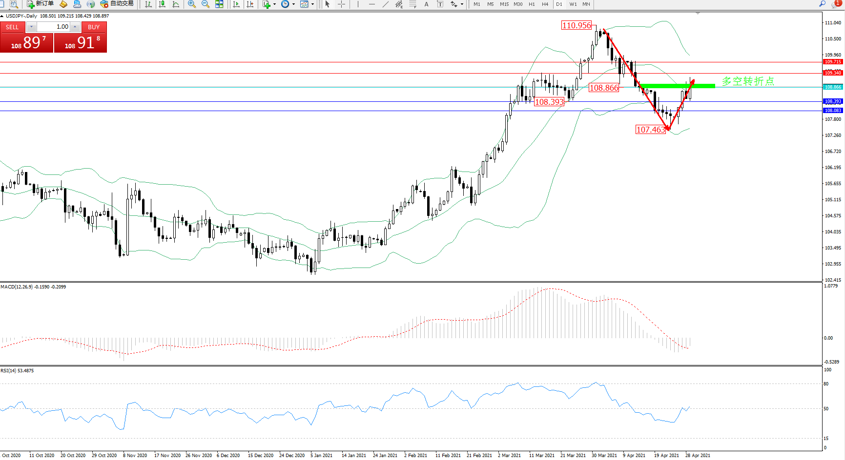 技术点评:高位空头动力延续空头下行走势持续下挫,触及布林带指标下轨附近节点后不断向下移动,空头动力下行至107.463附近得到支撑短暂整理后急速回升,突破中轨附近节点后继续向上移动,布林带指标呈张口走势后开始缓慢收口中,MACD指标处于0轴线下方空头区域持续震荡后开始有回升迹象,RSI指标处于空头区域整理后急速反转上行,触及50均衡线节点整理;
