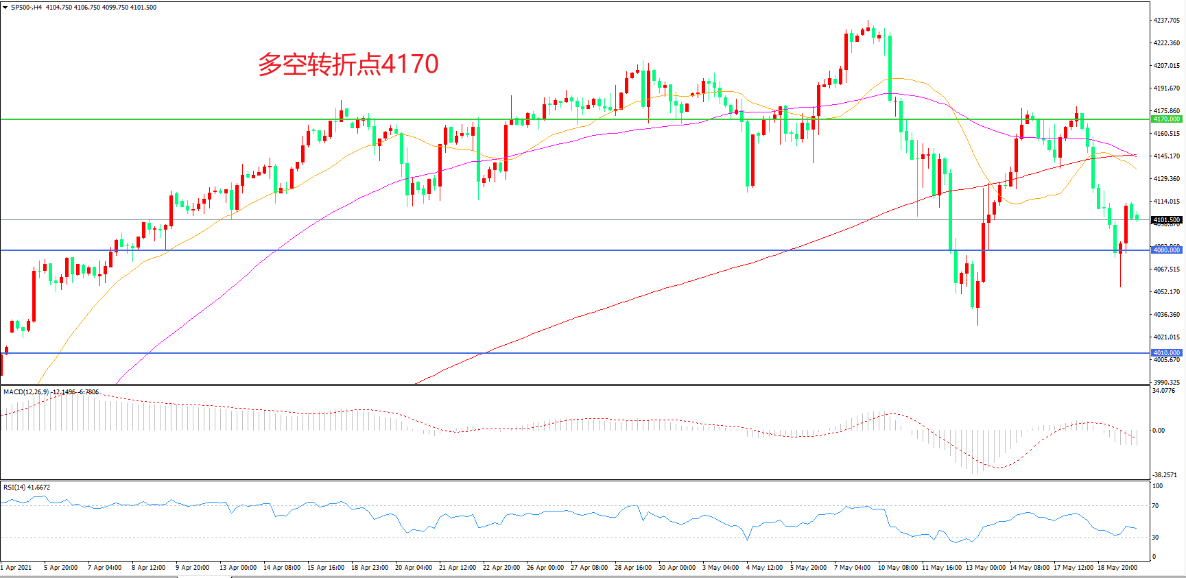 周三(5月19日),美联储公布最新的4月会议纪要,美联储官员在此次会议上对通胀基本持有乐观态度,但纪要内容暗示若经济继续迅速复苏,联储可能考虑调整当前的宽松政策,美元指数刷新日高,10年期美债收益率刷新四日高位,标普500跌幅一度有所扩大,但在科技股的引领下探底回升,收报4104.25点。在财报季接近尾声时,通胀走势和货币政策是市场最为关心的焦点。