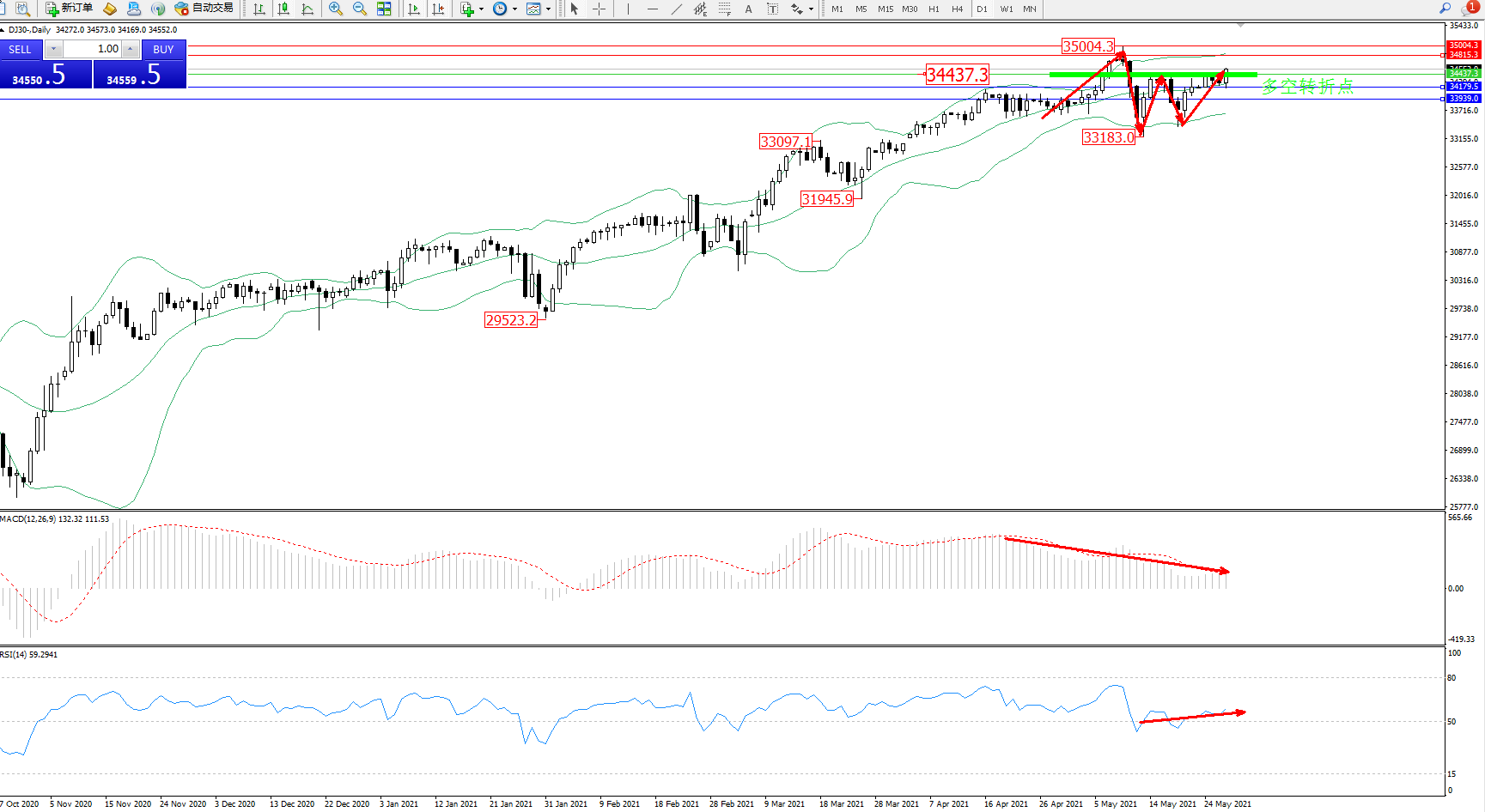 技术点评:多头动力延续布林带指标通道中上轨区间持续震荡上扬,高位抵达35004位置后遇阻回撤,长时间维持在中轨上轨弱势徘徊后终究迎来强势拉升,关注中轨附近节点,布林带指标呈收口平移走势良好,MACD指标处于多头区域高位维持震荡向下移动后弱势徘徊,RSI指标处于50均衡线附近不断震荡平移中;
