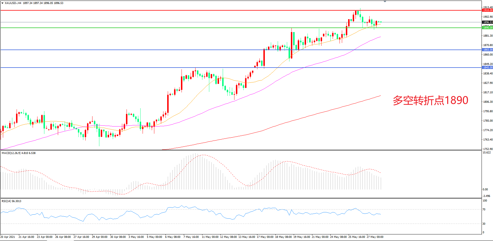 周四(5月27日),美国当周初请失业金人数超预期下降,拜登据称将提出下个财年6万亿美元的政府支出预算案,在支出计划的报道和强劲经济数据支持下,美国投资者信心回升,10年期美债收益率创一周多来最大涨幅,现货黄金小幅回落,收报1896.42美元/盎司。但随着各国政府斥巨资刺激受到抗疫封锁打击的经济,人们越来越担心通胀将在全球经济中卷土重来,通胀预期依然是黄金上行的最大推手。