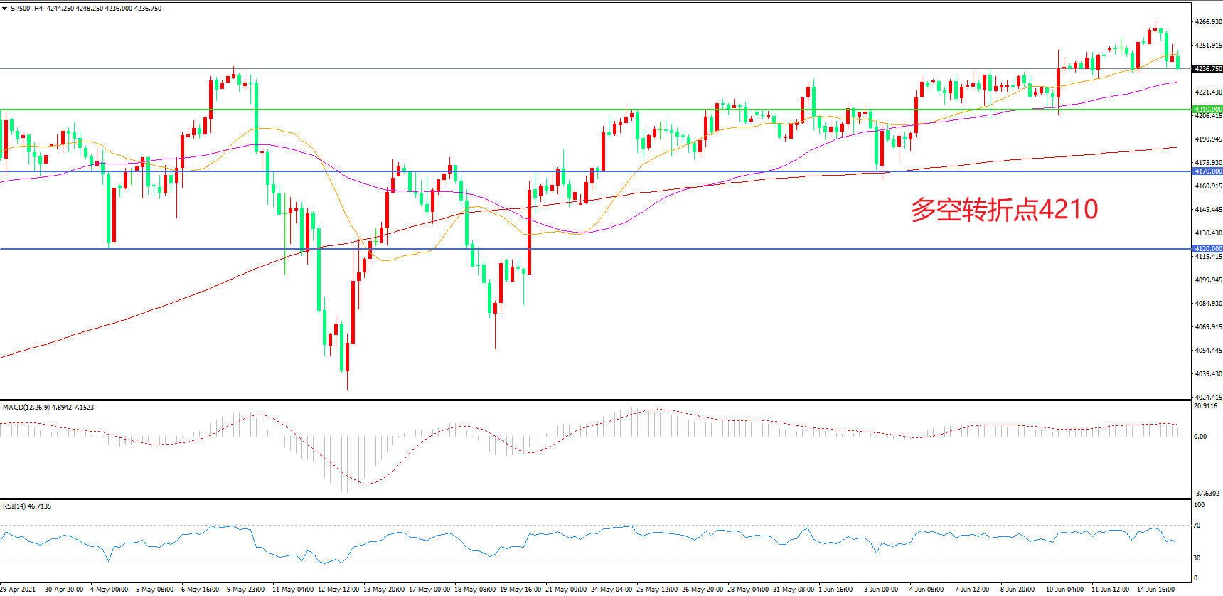 4小时图看,标普500小幅回落,上行趋势放缓,但形态依然完好,4210成为短线支撑,MACD红柱缩短,RSI指标走平,日内延续震荡概率较大。