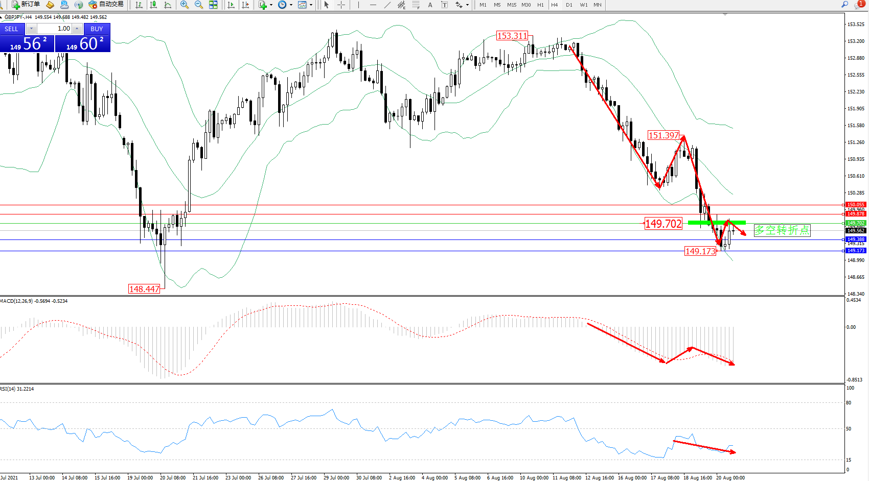 技术点评:空头动力延续布林带指标中下轨区间持续震荡向下移动中,低位抵达149.173位置得到短暂支撑开始回升,但下行趋势依旧未见最终止步迹象,布林带指标呈张口向下移动持续中,MACD指标处于0轴线下方空头区域维持震荡,RSI指标处于空头区域低位维持震荡平移中;