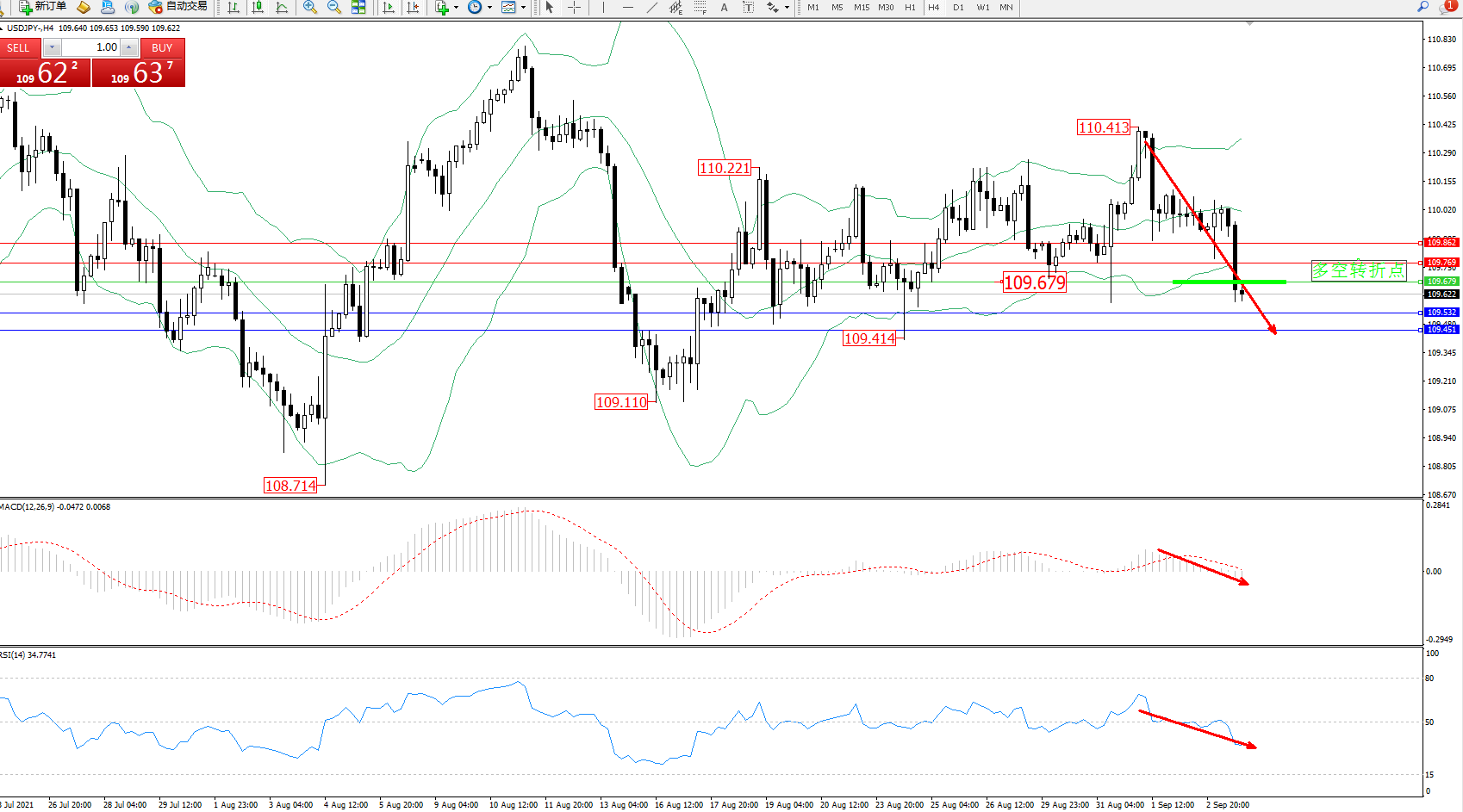 交易策略:109.679下方看跌,目标109.532、109.451