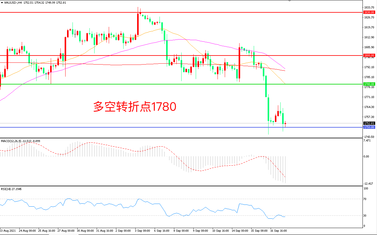 4小时图看,金价长阴连续下破,短期走势极度低迷,均线系统呈空头排列, 1750成为下方支撑,MACD绿柱增加,RSI指标走平,日内震荡下行概率较大。