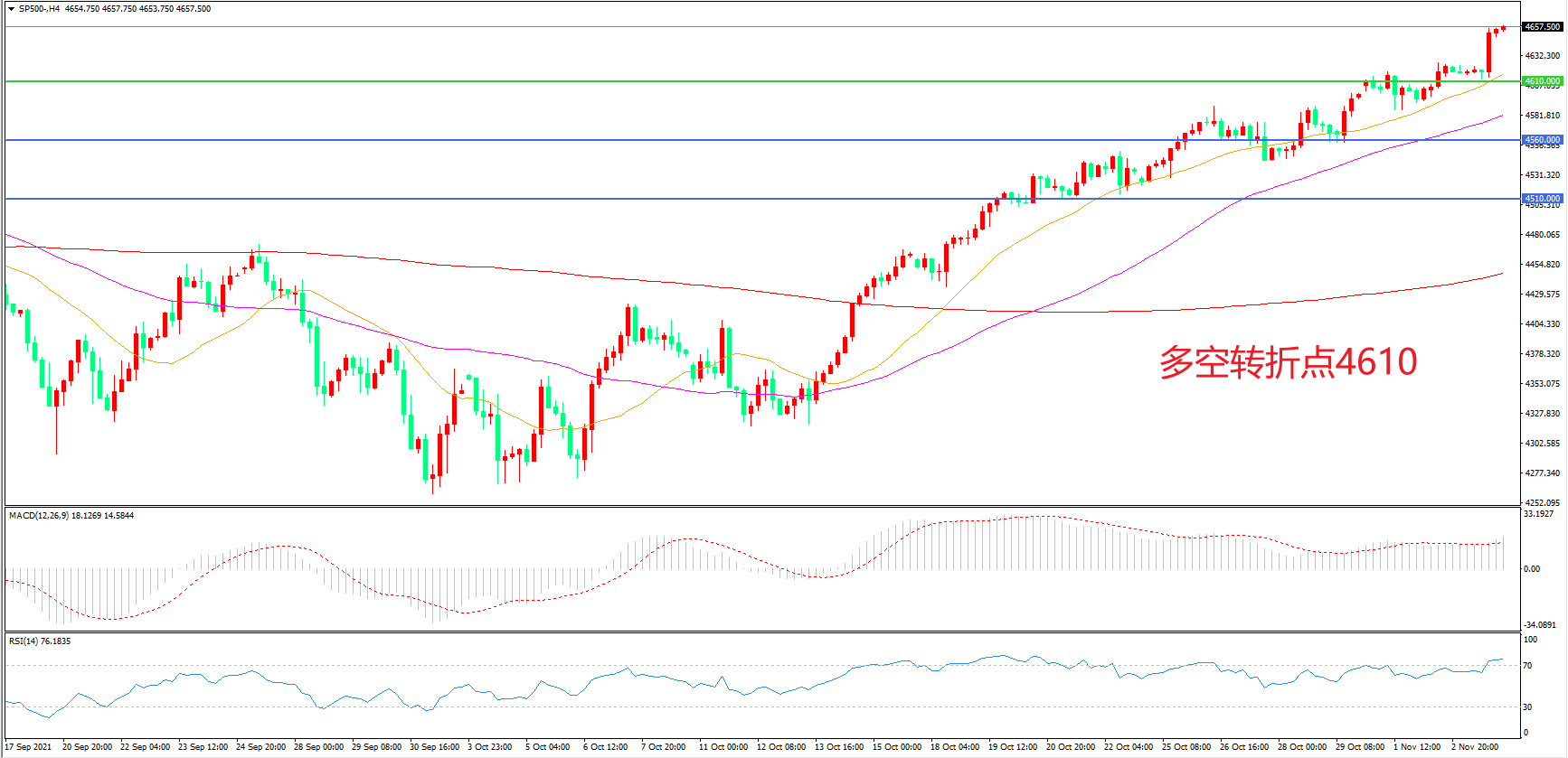 周三(11月3日),美联储如期Taper,宣布每月少买150亿美元债券,但美联储主席鲍威尔鸽派的表态成为拯救美股的“白马骑士”,标普500小幅回落后大幅拉升,收报4653.75点。鲍威尔会后强调,开始Taper不意味着发出加息信号,在加息时间方面联储“可以有耐心”,宽裕的流动性环境将继续对美股形成支撑。