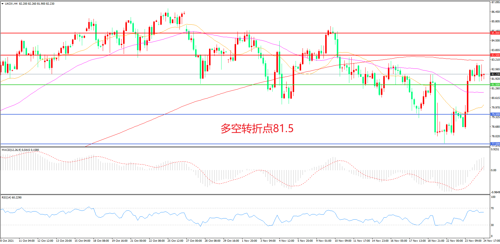4小时图看,油价延续高位震荡,整体波幅不大,200周期均线成为上方阻力,81.5成为下方支撑,MACD红柱增加,RSI指标走平,日内震荡上行概率较大。
