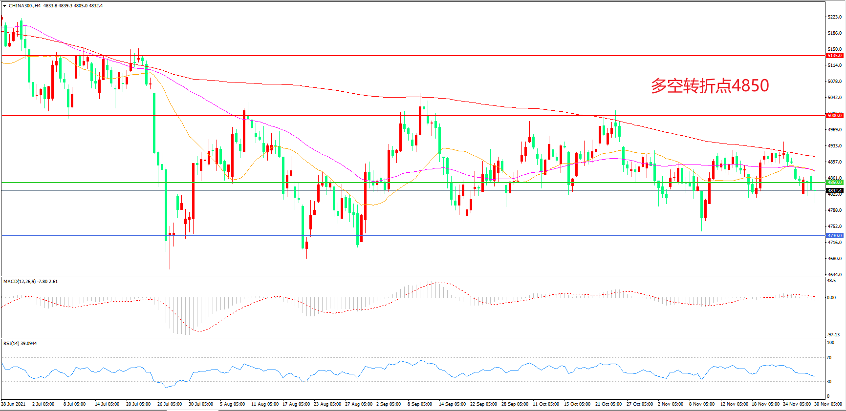 4小时图看,沪深300延续高位震荡,整体波幅不大,均线系统呈空头排列,4850成为多空分水岭,MACD绿柱增加,RSI指标走平,日内延续震荡概率较大。