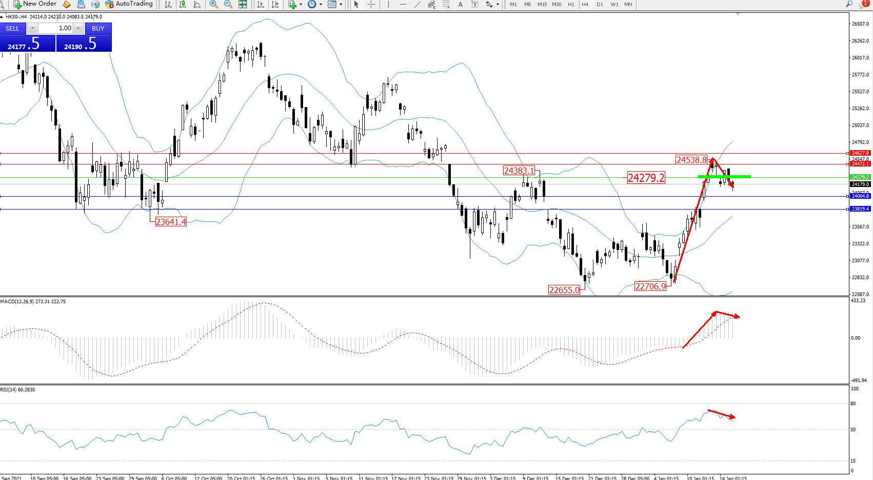 技术点评:多头动力延续布林带指标上轨附近持续震荡上扬,高位抵达24538位置后遇阻震荡回撤,短期高位空头动力伺机入场,布林带指标呈张口走势后开始逐步收口,MACD指标处于多头区域维持震荡上移后开始平移,RSI指标处于多头区域维持震荡上行后遇阻反转整理下行;