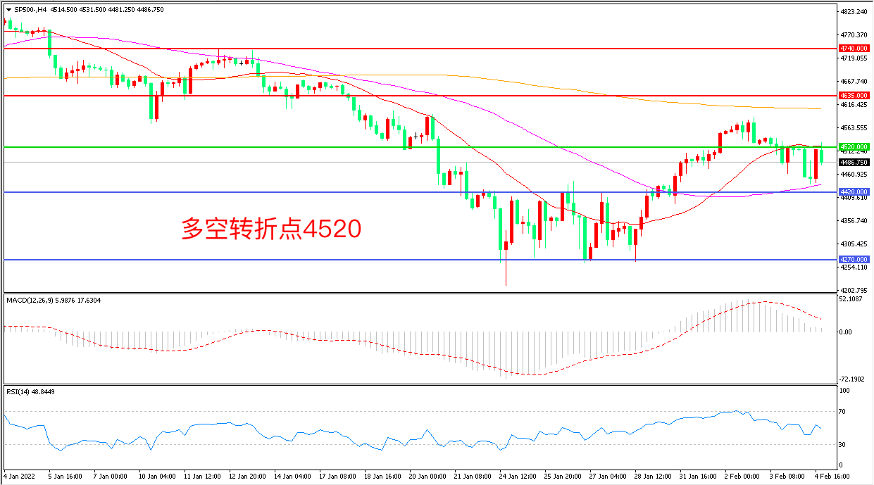 4小时图看,标普500延续宽幅震荡形态,多空博弈胶着,4520成为多空分水岭,55均线成为下方支撑,MACD红柱缩短,RSI指标走平,日内震荡下行概率较大。
