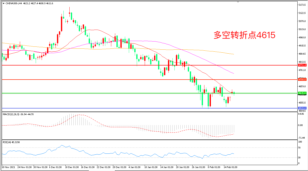 4小时图看,沪深300高开后窄幅震荡,横盘继续明显,均线系统仍呈空头排列, MACD绿柱缩短,RSI指标走平,日内延续震荡概率较大。