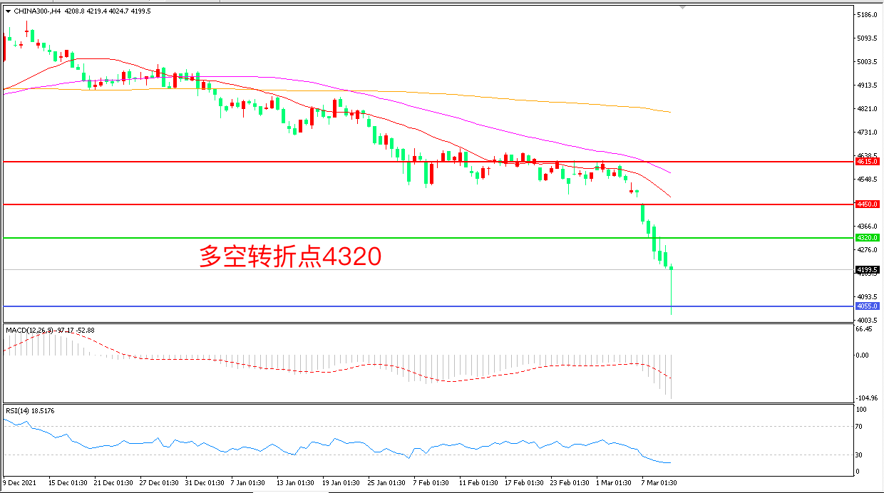 4小时图看,沪深300 长针探底,短线有止跌迹象,但均线系统仍呈空头排列, MACD绿柱增加,RSI指标走平,日内震荡下行概率较大。