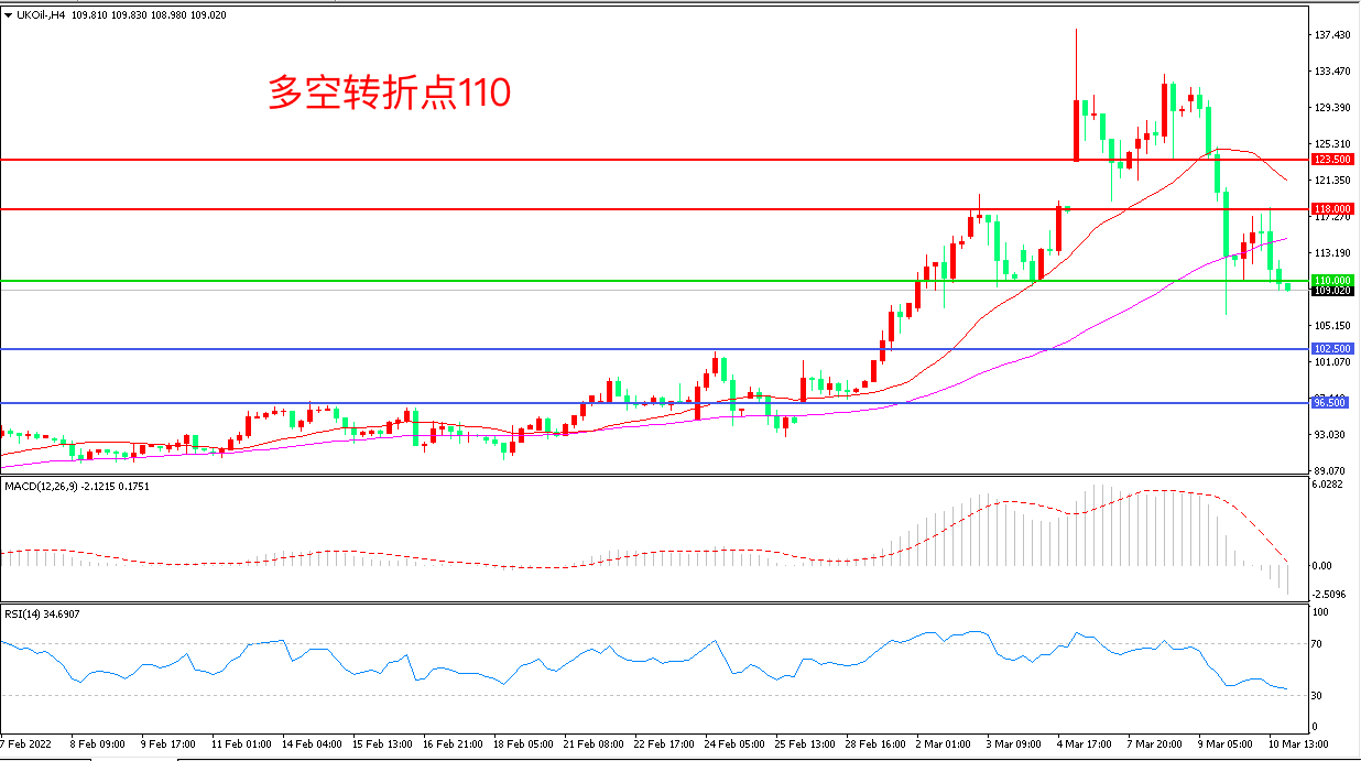 4小时图看,油价长阴连续下坡,前期涨势被吞噬殆尽,110美元成为多空分水岭,MACD红柱缩短,RSI指标走平,日内延续震荡概率较大。