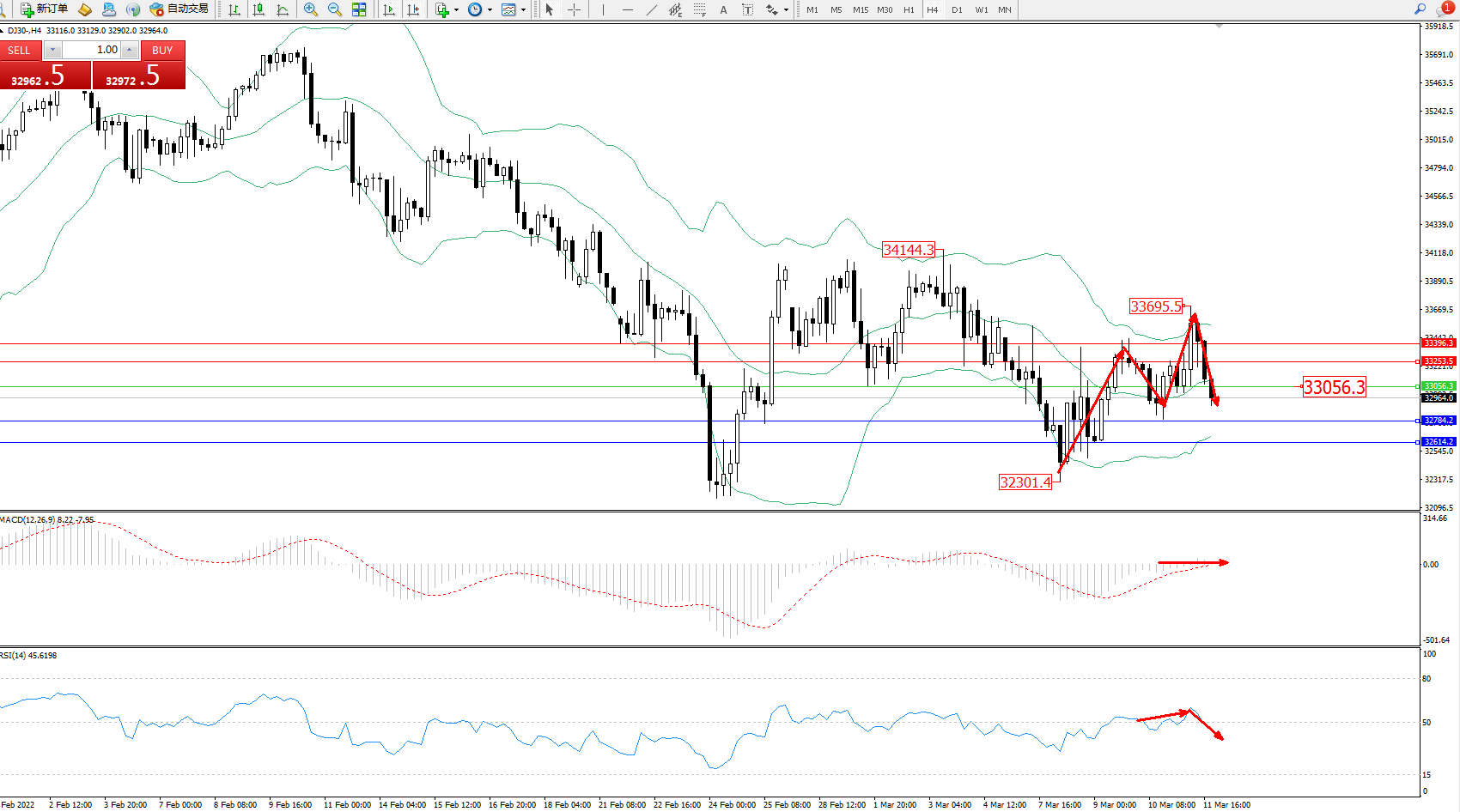 技术点评:低位多头动力维持震荡上扬,突破布林带指标上轨至33695位置节点后急速下挫,处于中轨下方不断下行,布林带指标呈收口走势中,MACD指标处于0轴线附近弱势徘徊中,RSI止步处于50均衡线附近窄幅整理中;