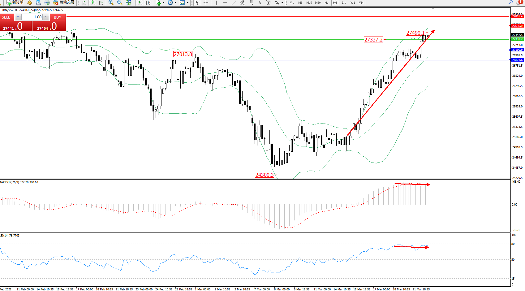 日经指数JPN225——4小时K线图显示: