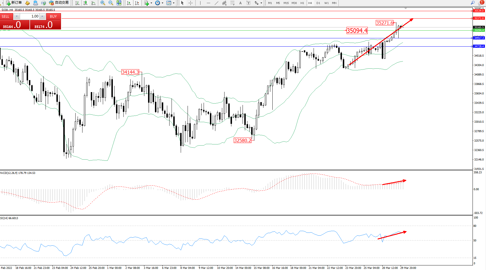 道琼斯指数DJ30——4小时K线图显示: