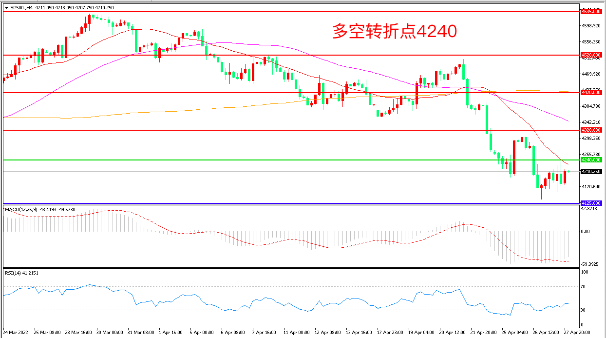 4小时图看,标普500长阴下破后宽幅震荡,短线走势偏弱,21周期均线成为上方阻力,MACD绿柱增加,RSI指标走平,日内冲高回落概率较大。