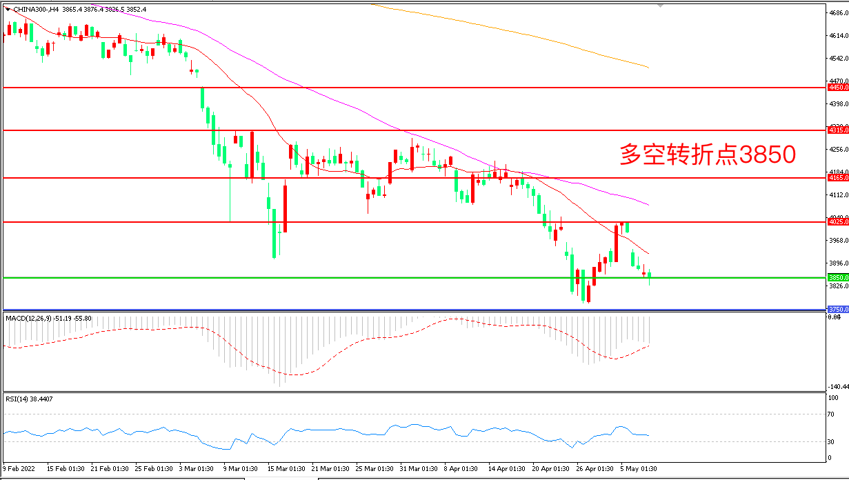 4小时图看,沪深300低开低走后窄幅震荡,整体表现疲软,均线系统呈空头排列,MACD绿柱增加,RSI指标走平,日内震荡下行概率较大。