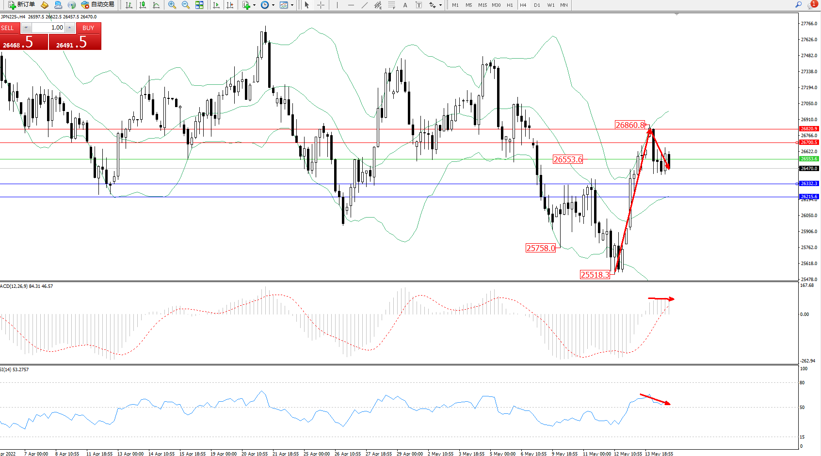 日经指数JPN225——4小时K线图显示: