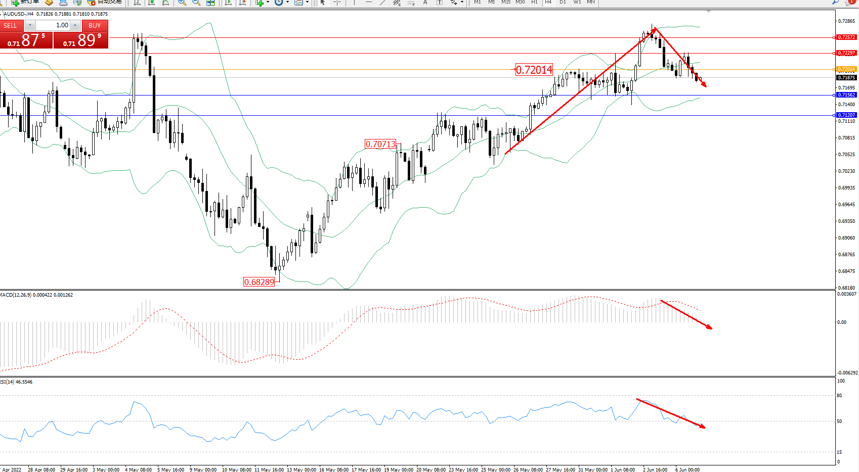 交易策略:0.72014下方看跌,目标0.71562、0.71207