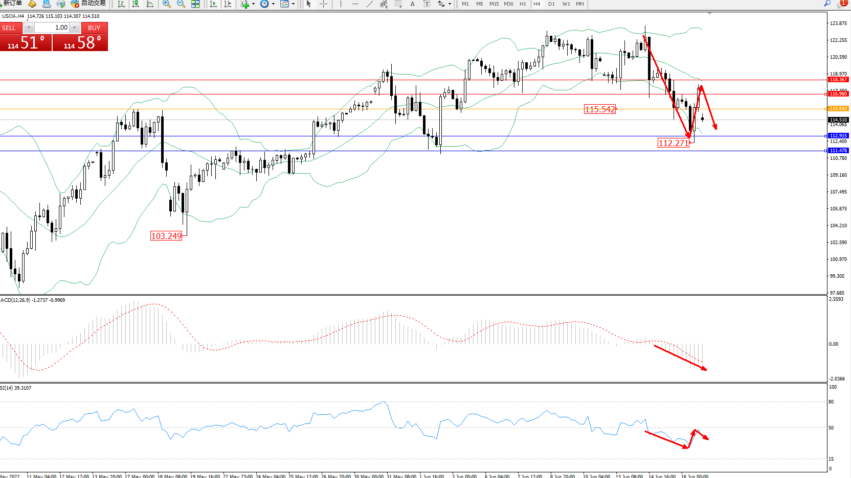 原油维持114.510附近震荡,鲍威尔讲话略微偏鸽,紧缩对于油价的短线利空冲击或有限。不考虑未来可能出现的衰退风险以及美联储给出更为超预期力度的紧缩表态,油价重心或继续维持在高位,就此开启趋势下跌言之尚早。