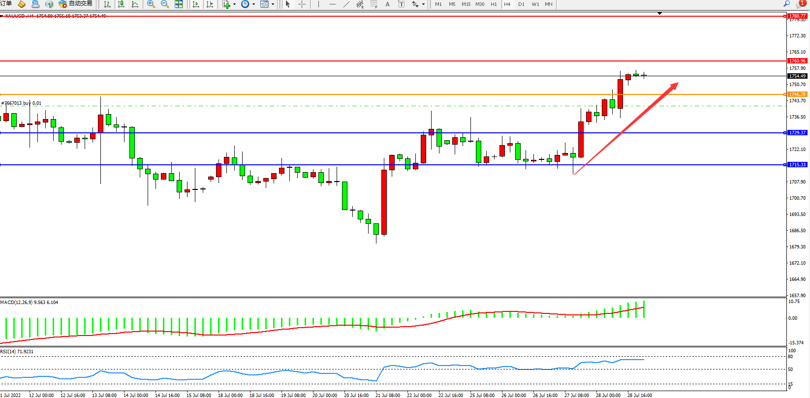 周四(728日)美国GDP数据录得-0.9%,为连续第二个季度负值,符合技术性衰退的标准定义。美指数阴跌不断,10年期美债收益率跌破2.7%,现货黄金上涨一度突破1750关口,最终收涨1.29%。在GDP数据引发衰退之际,美联储加息押注遭大幅下调,黄金有望持续获得反弹空间。
