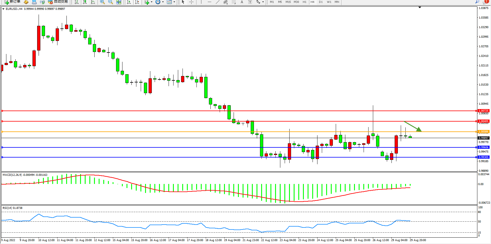 欧元兑美元0.99897附近震荡,欧洲央行决策者希望在9月政策会议上讨论加息75个基点,即使衰退风险迫在眉睫,因为通胀前景正在恶化。欧洲央行上个月将基准利率上调了50个基点至零,这是出乎意料的大动作,下一次进行相同幅度的加息也已经被计价。