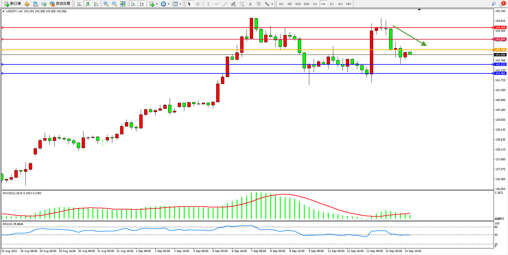 4小时图看:高位空头动力震荡回撤,市场整体处于区间震荡,空头缓慢入场,MACD指标处于0轴线上側徘徊,RSI指标处于50均衡线附近弱势整理;