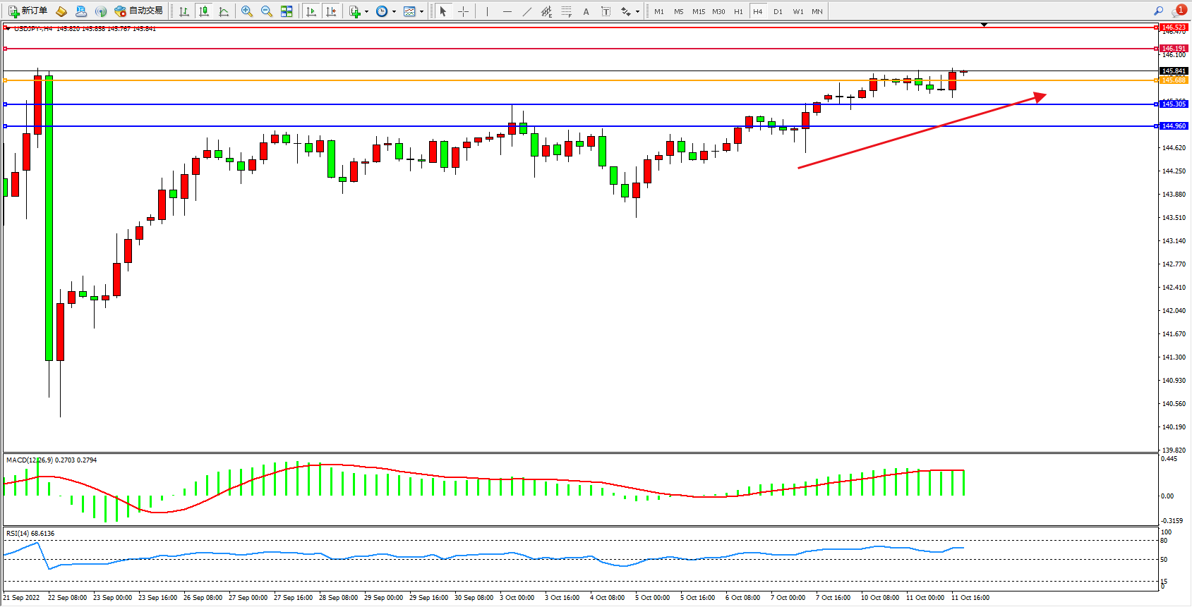 4小时图看:多头动力维持窄幅弱势向上移动,短期高位窄幅整理,市场多头情绪依旧,MACD指标处于多头区域整理平移,RSI指标处于多头区域持续徘徊;