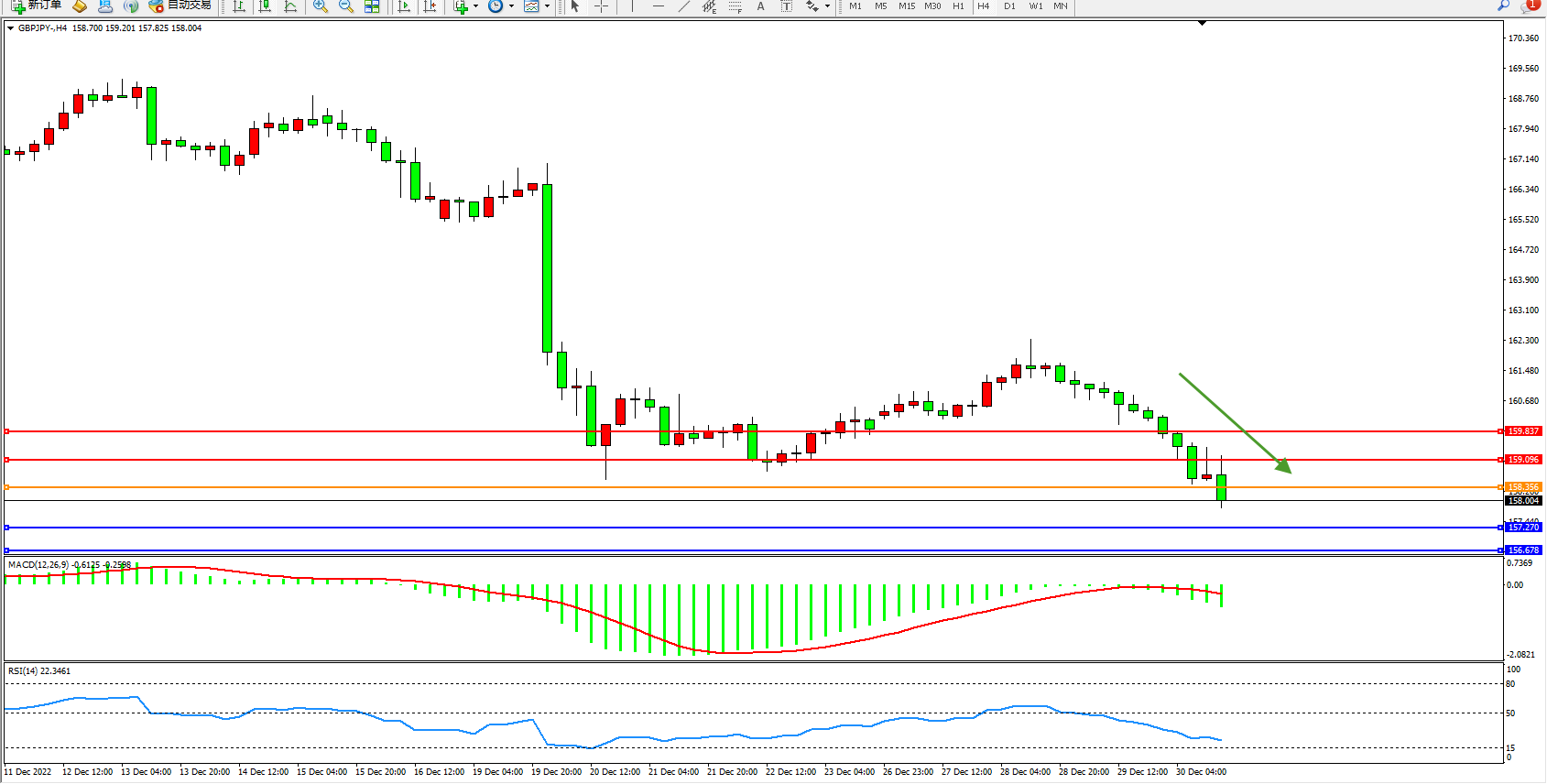 交易策略:158.356下方看跌,目标157.270、156.678