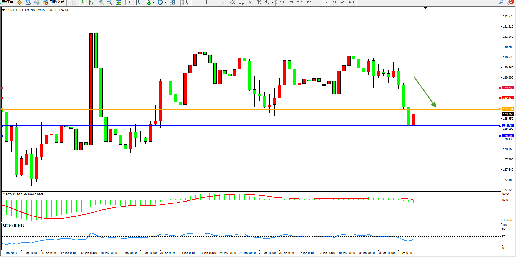4小时图看:短期高位整理后,空头动力急速下挫,市场看空情绪笼罩,短期有继续向下移动态势,MACD指标处于0轴线整理下移,RSI指标处于50均衡线下侧空头区域震荡;